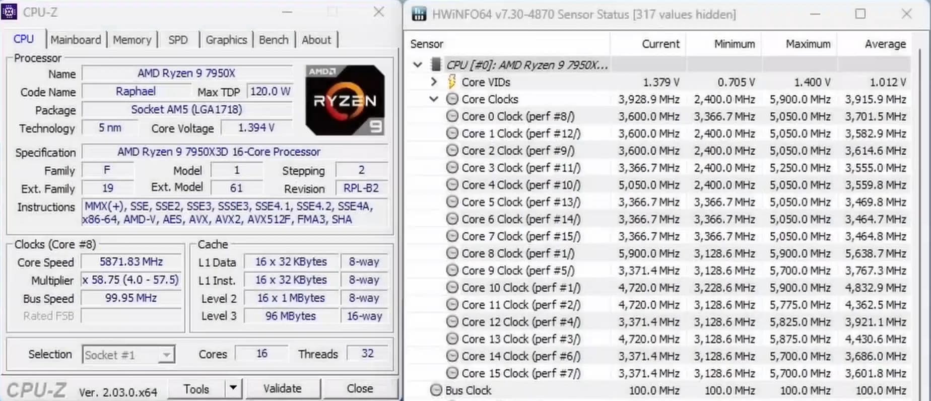 В частности, у Ryzen 9 7950X3D, как известно, дополнительная микросхема кеш-памяти расположена только на одном чиплете. И AMD пришлось достаточно необычным образом менять поведение CPU для того, чтобы он работал при таких изменениях. Чиплет CCD0 (с 3D V-Cache) имеет нижний предел максимальной частоты 5250 МГц и нижний предел напряжения 1,2 В, в то время как CCD1 (без 3D V-Cache) может достигать 5750 МГц и 1,4 В. При включённом режиме PBO2 и оптимизаторе кривой напряжения/частоты можно заставить CPU работать на более высоких частотах.
