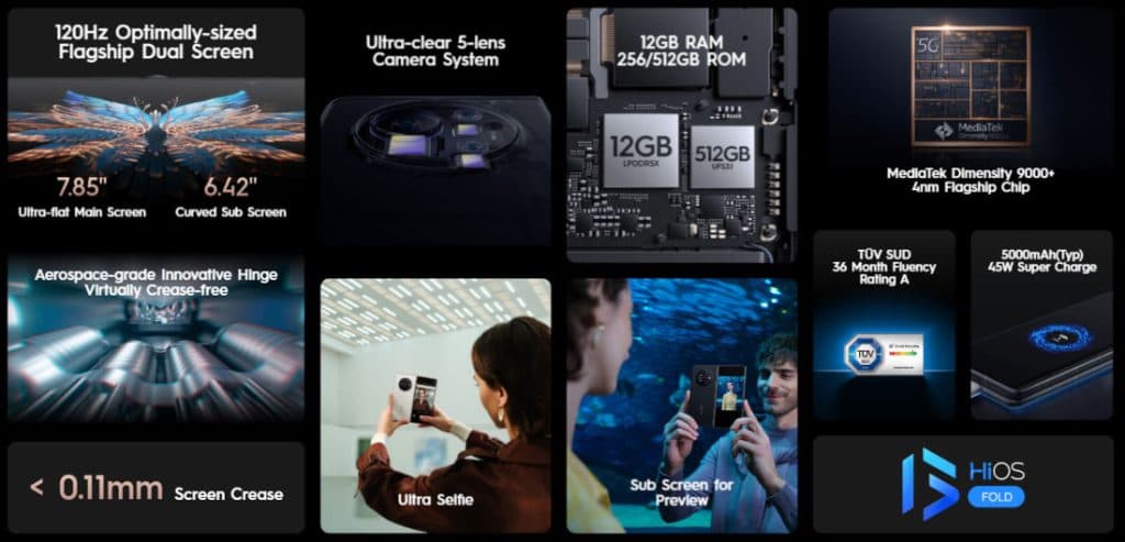 Аппаратная основа Tecno Phantom V Fold — это SoC MediaTek Dimensity 9000+, программная — Android 13 с интерфейсом HiOS 13 Fold. Объём оперативной памяти LPDDR5X составил 12 ГБ, объём встроенной флеш-памяти UFS 3.1 — 256 или 512 ГБ.