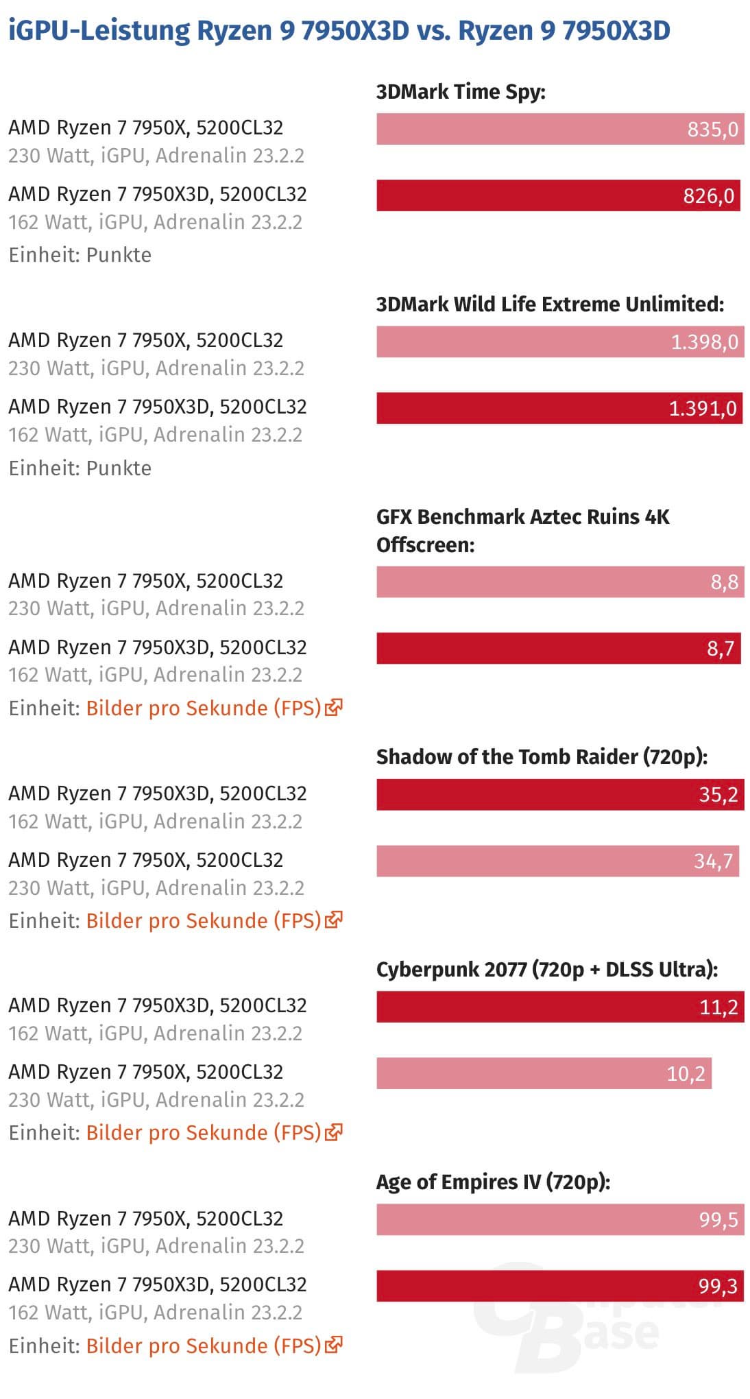На днях ресурс PC Mag провёл тесты процессора Ryzen 9 7950X3D и обнаружил феноменальный прирост производительности интегрированного графического ядра в сравнении с Ryzen 9 7950X при идентичных параметрах. Однако, возможно, это было какой-то ошибкой, так как тесты ComputerBase указывают на то, что никакого существенного прироста нет.