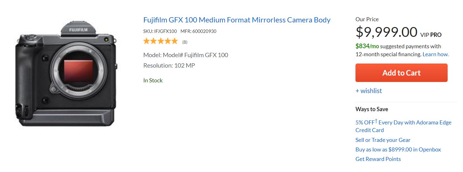 Судя по всему, среднеформатная камера Fujifilm GFX 100, представленная 23 мая 2019 года, не доживет до своего четырехлетия: она уже исчезла из продажи в ряде магазинов у себя на родине в Японии, в каталоге крупного ретейлера B&H Photo она все еще доступна, но только в рамках спецзаказа. И хотя камеру можно купить на площадках Adorama и Amazon, очевидно, что эта возможность будет ровно до тех пор, пока не раскупят последние экземпляры.