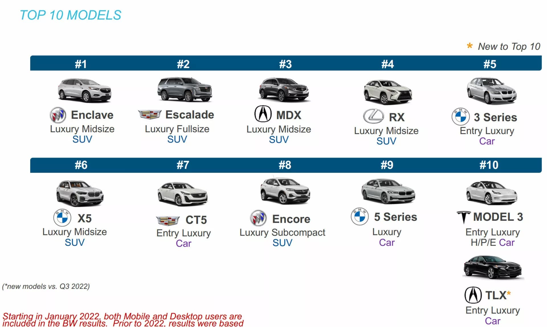 Также исследователи Kelley Blue Book Brand Watch привели перечень самых востребованных у покупателей в США люксовых моделей вне зависимости от типа силовой установки. Возглавил этот рейтинг Buick Enclave, за ним следуют Chevrolet Escalade и Acura MDX. Из хорошо известных в России моделей в этот перечень вошли Lexus RX, BMW 3-Series, BMW X5, BMW 5-Series.
