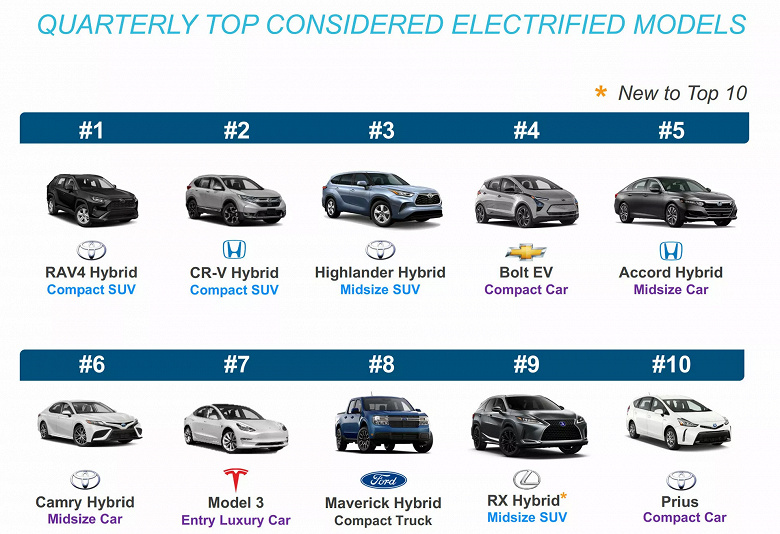 Исследователи привели топ-10 самых покупаемых электрифицированных автомобилей в США. Интересно, что Tesla тут далеко не на первых позициях: лидер рейтинга – Toyota RAV4 Hybrid, за ним следуют Honda CR-V Hybrid и Toyota Highlander Hybrid. А вообще пять из десяти самых покупаемых электрифицированных автомобилей в США – у Toyota (если считать вместе с единственным Lexus).