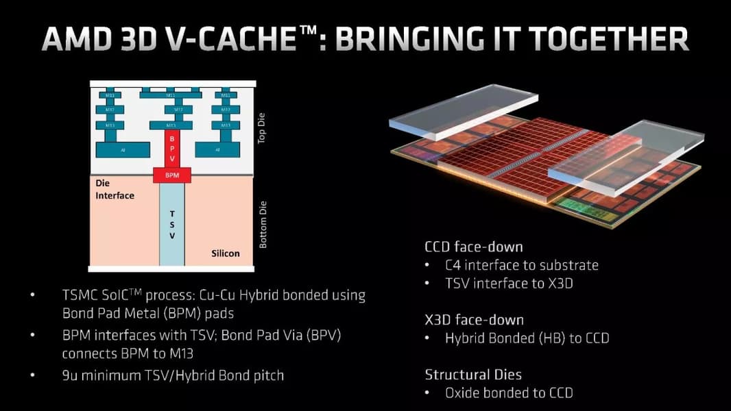 Как уже упоминалось, процессорные чиплеты в новых Ryzen производятся по нормам 5 нм, это значит, что сами кристаллы относительно предыдущего поколения стали меньше. Микросхема 3D V-Cache тоже стала меньше, но всё же AMD столкнулась с проблемой разной площади собственной кеш-памяти чипа CCD и микросхемы 3D V-Cache. Из-за этого компании пришлось изменить характеристики и конфигурацию вертикальных соединений TVS, посредством которых две микросхемы обмениваются данными.