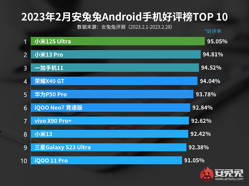 Статистика собрана в период с 1 по 28 февраля 2023 года. В рейтинге AnTuTu используются средние, а не самые высокие результаты. Для каждого смартфона учитывались результаты не менее 1000 тестов — модели с меньшим количеством тестов в рейтинг не попадают.