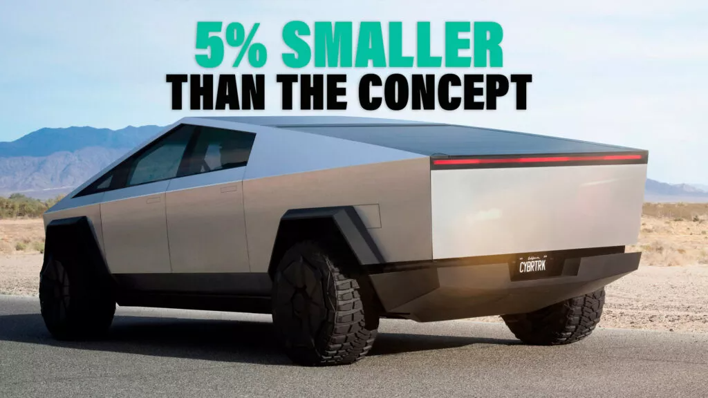 Tesla Cybertruck на самом деле немного меньше (на 5% процентов), чем концепт. В результате он меньше, чем и Ford F-150 Raptor, но с более длинной платформой и, предположительно, более объёмным местом для груза.
