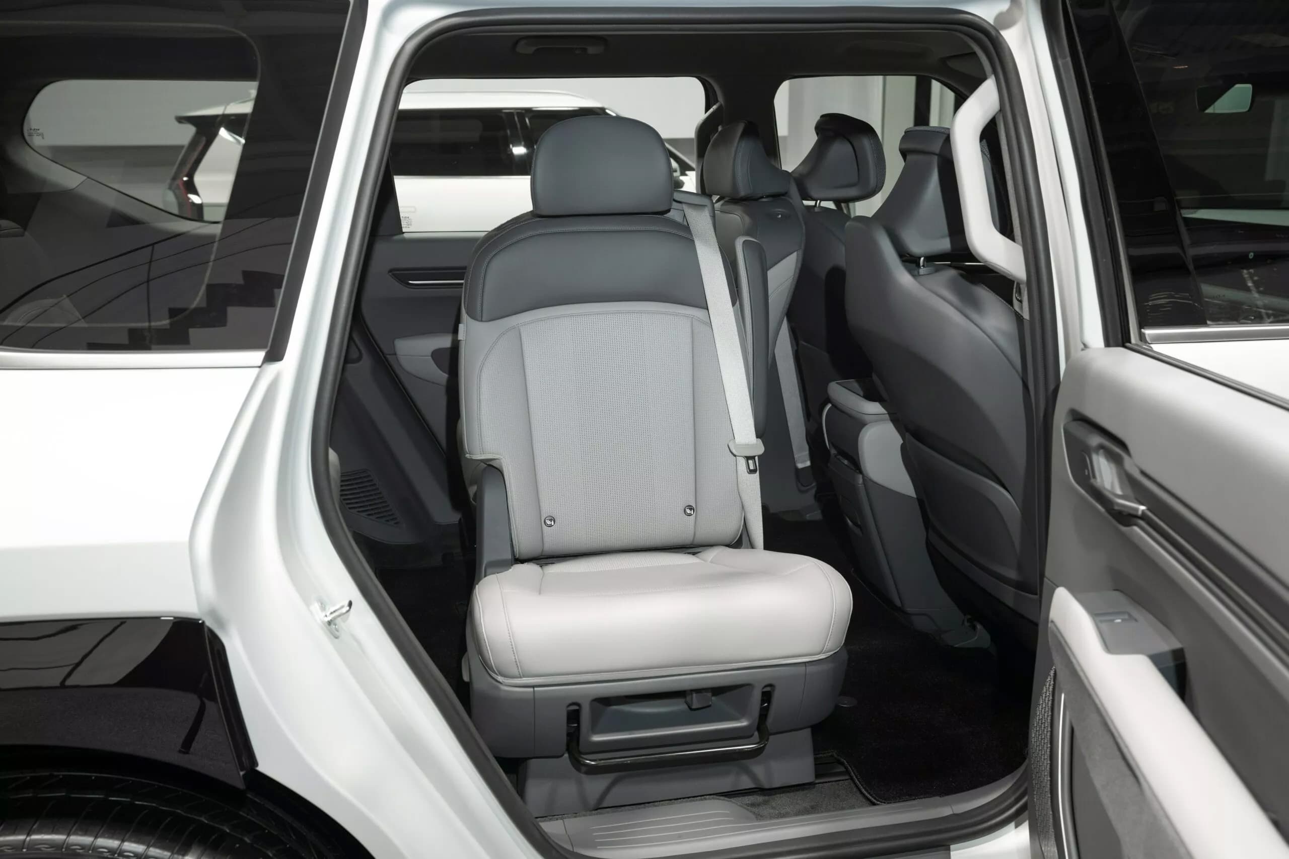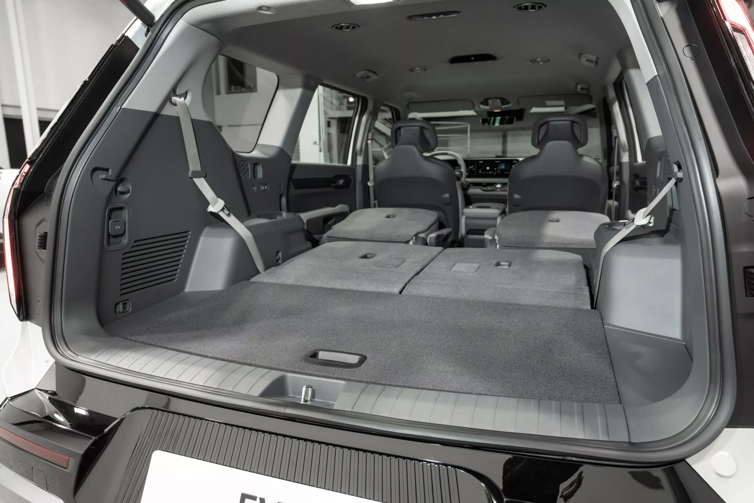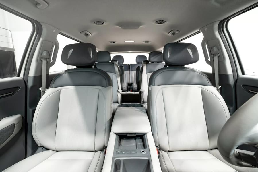 Платформа E-GMP предусматривает очень компактное размещение электромоторов (тут будут версии как с одним, так и с двумя — в топовой версии мощность составит около 400 л.с.) для того, чтобы обеспечить максимальное пространство пассажирам. У EV9 будут варианты с посадочной формулой 2 + 2 + 2 и 2 + 3 + 2, и в первом случае сидения второго ряда могут поворачиваться на 180 градусов. Характеризуя внутреннее пространство EV9, Kia говорит о «большом пространстве для всех пассажиров, чтобы общаться и отдыхать комфортно, как в гостиной».