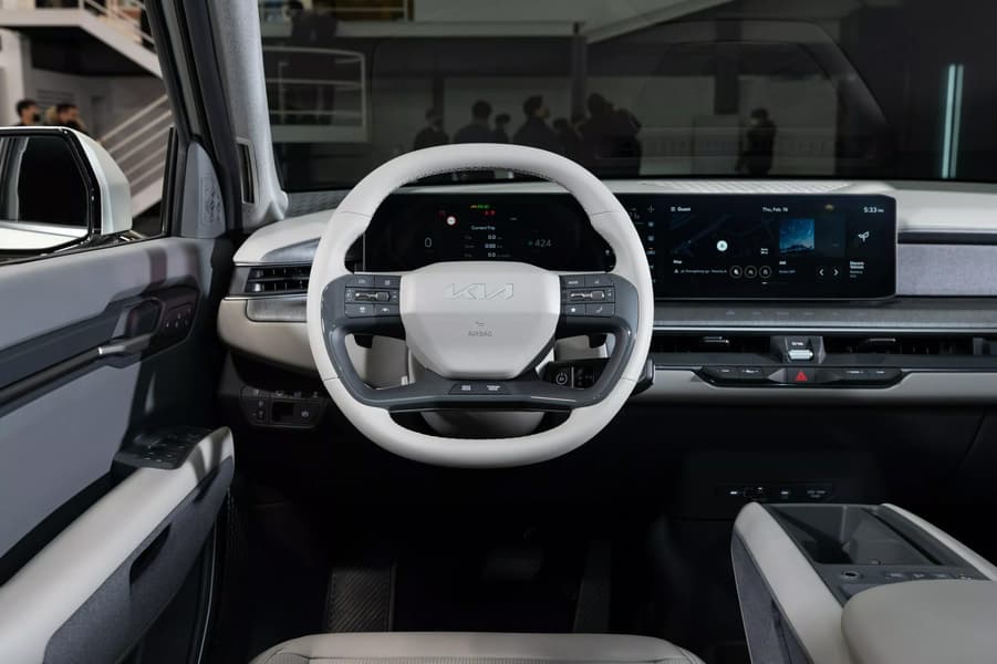 На передней панели создатели EV9 разместили два экрана с диагональю 12,3 дюйма. Интересно, что есть и ещё один, 5-дюймовый, который, вероятно, будет задействован для управления климат-контролем.