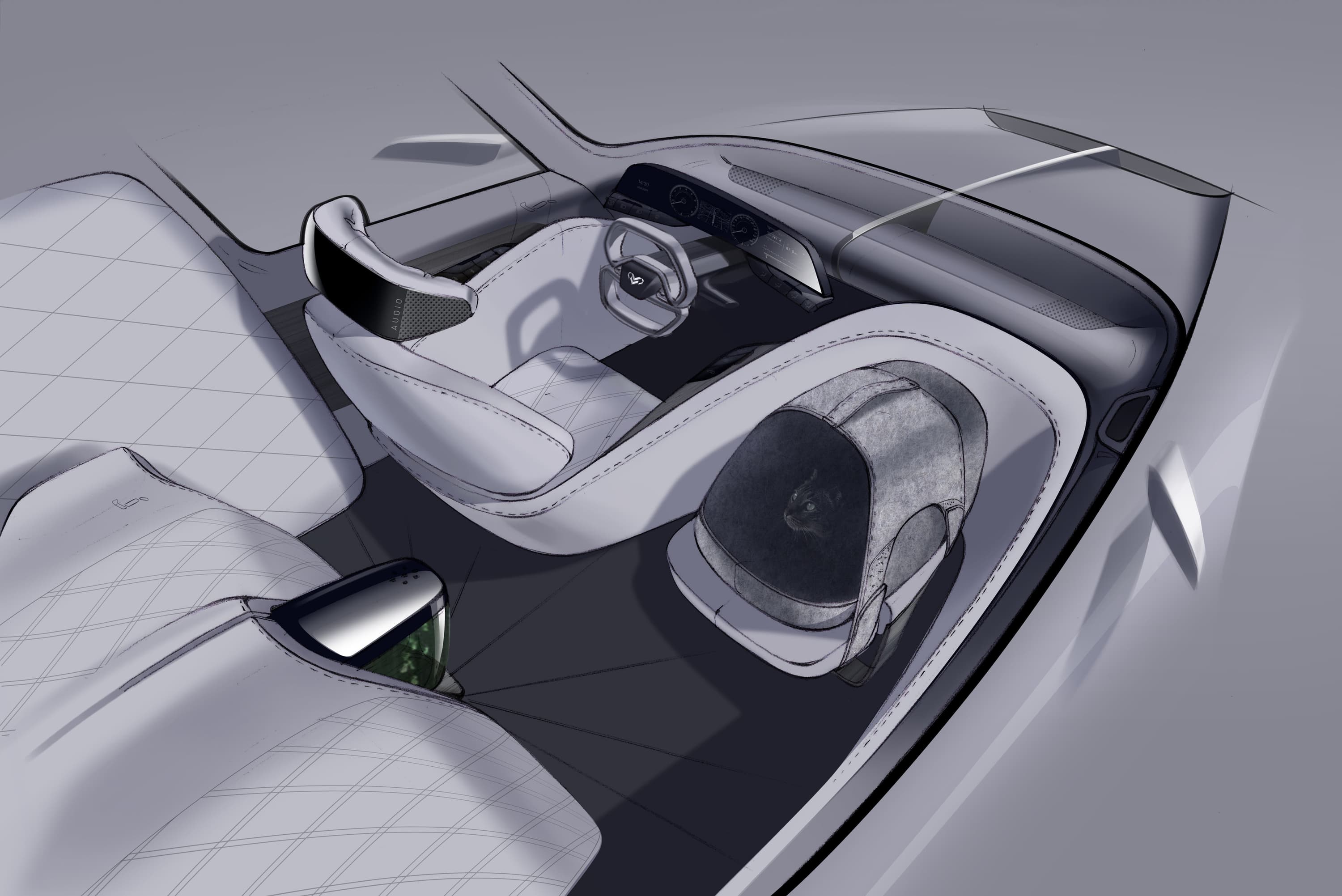 Qoshcar GT Vision 1 станет первой моделью компании, но всего их планируется пять. Особенность Qoshcar GT Vision 1 состоит в форме кузова, характерной для автомобилей Grand Tour (хотя предусмотрены и другие варианты), в асимметричных дверях (две слева и одна большая справа) и отсутствием переднего пассажирского сидения (переноска с котом на этом месте – просто находка дизайнеров).