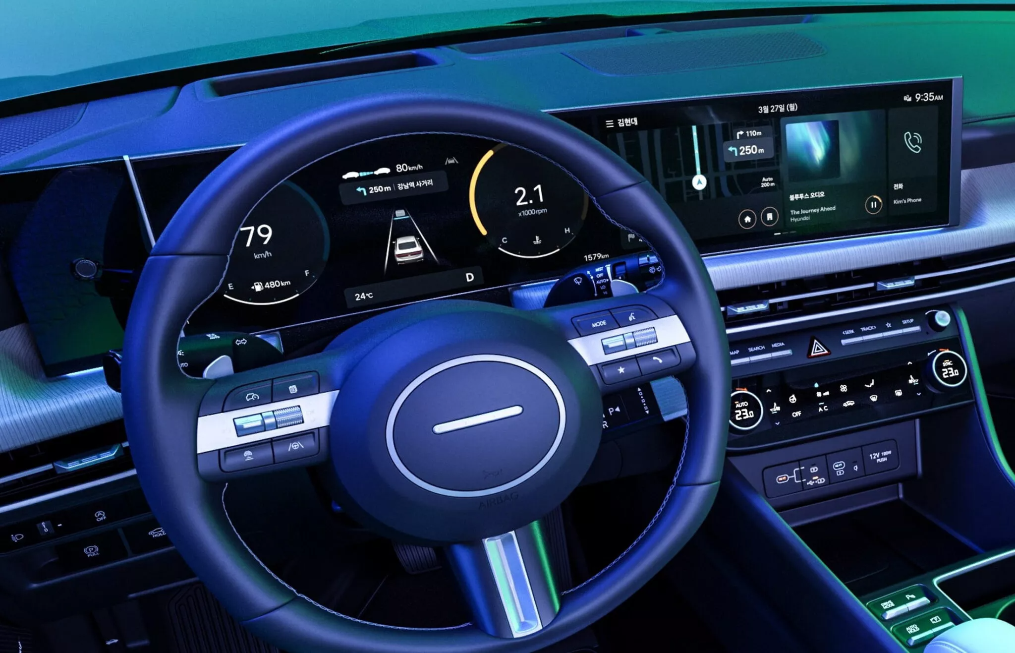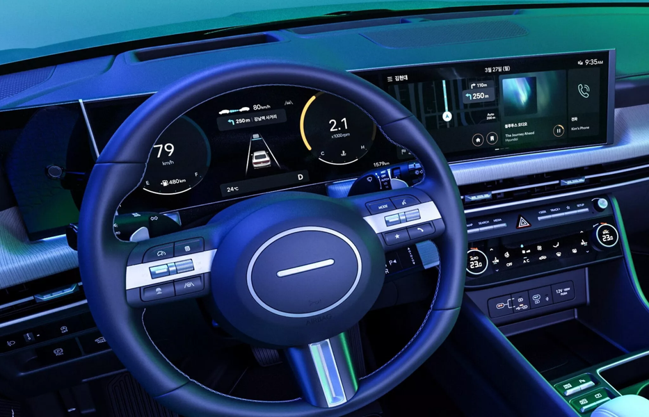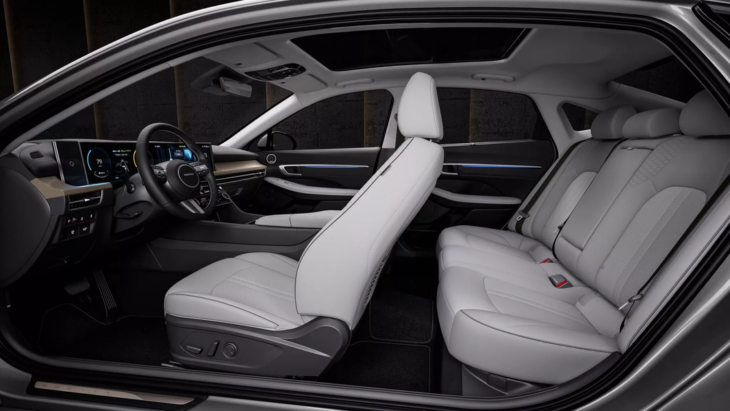Многочисленные изменения коснулись и салона Sonata. Наиболее очевидным изменением стала установка 12,3-дюймовой цифровой приборной панели и 12,3-дюймового информационно-развлекательного экрана. Оба размещены на изогнутом панорамном дисплее, выступающем из передней панели. В модели 2024 года также используется новый контроллер переключения передач.
