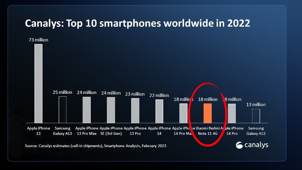 Лу Вейбинг также представил глобальный рейтинг поставок мобильных телефонов за 2022 год, опубликованный авторитетной исследовательской организацией Canalys. В этом рейтинге Redmi Note 11 вошёл в первую десятку с объёмом продаж 18 миллионов, как и у iPhone 14 Pro и iPhone 14 Pro Max.