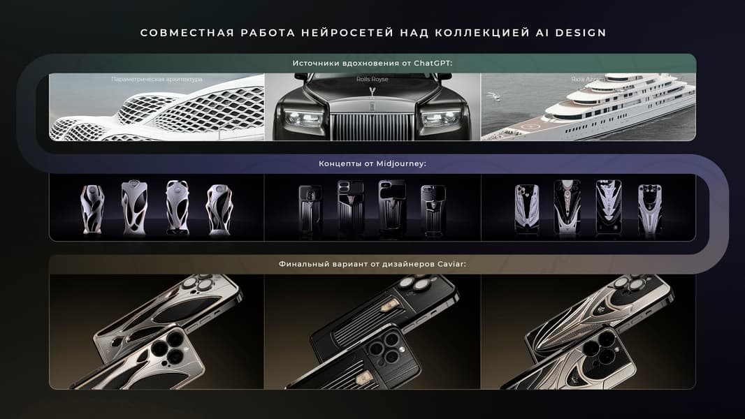 Компания Caviar, известная своими невероятно дорогими вариантами популярных смартфонов, выпустила новую коллекцию iPhone «в стиле нейролюкс» на волне популярности нейросетей. Для создания дизайна моделей коллекции AI Design использовались мощности ChatGPT и Midjourney.