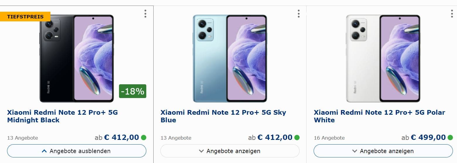 Получалось так, что даже более мощный и тоже 200-мегапиксельный Xiaomi 12T Pro на тот момент был доступнее. Сейчас же стоимость Redmi Note 12 Pro+ снизилась — и снизилась заметно: На eBay новинку можно купить за 429 евро, но есть варианты даже доступнее — за 412 евро. При этом Xiaomi 12T Pro в Европе подорожал до 550 евро — статус-кво восстановлен.