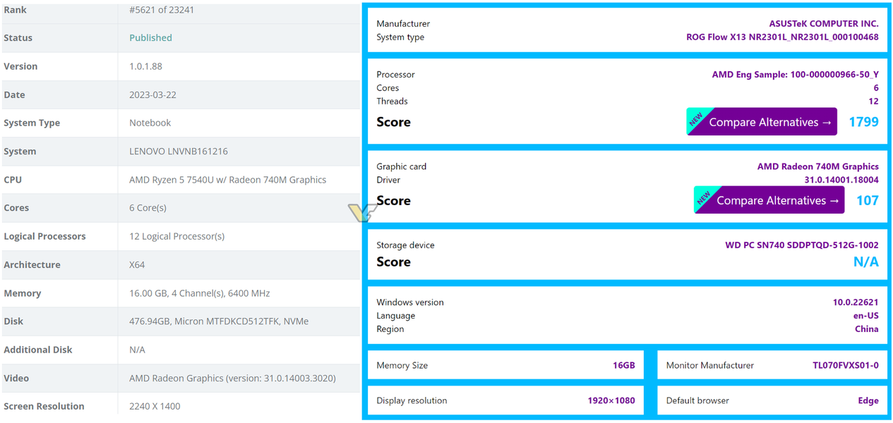 В Сети появилось очередное доказательство того, что в обозримом будущем AMD выпустит энергоэффективные мобильные процессоры Ryzen 7040U, которые будут совмещать новейшие процессорные ядра Zen 4 и GPU на основе RDNA 3. В частности, в составе ноутбуков Asus и Lenovo засветился APU Ryzen 5 7540U.