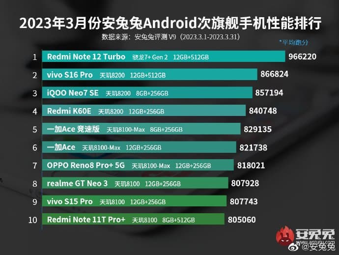 Представленный на прошлой неделе Redmi Note 12 Turbo сходу возглавил мартовский рейтинг субфлагманов под управлением Android. Да не просто возглавил, а набрал на 100 тыс. баллов больше модели, находящейся на второй позиции перечня. Это существенный отрыв.