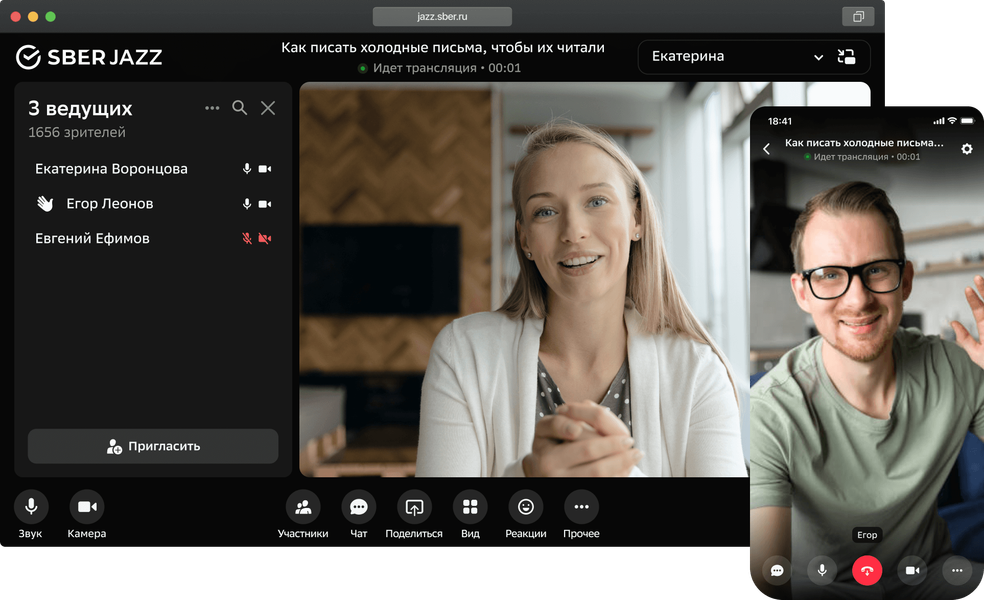 В вебинарах SberJazz доступны все опции корпоративной версии сервиса, включая автоматическую текстовую расшифровку диалогов, запись встреч, чат с реакциями и одновременную демонстрацию экрана сразу несколькими спикерами.