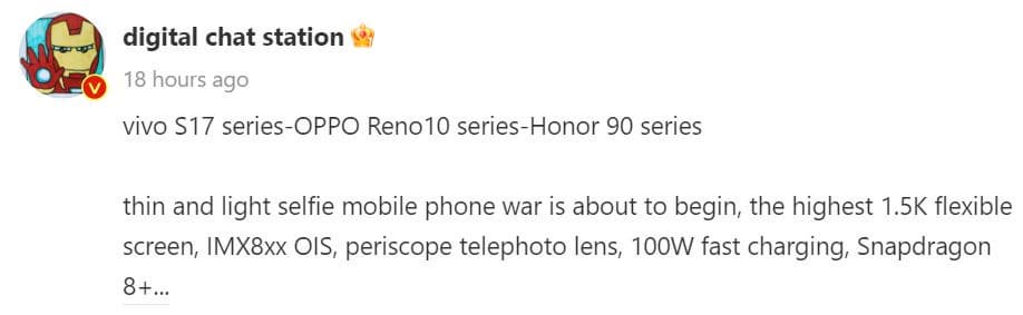 Инсайдер конкретно указывает три серии устройств от трёх производителей — это линейки Vivo S17, Oppo Reno10 и Honor 90. Смартфоны этих серий получат экраны с разрешением 1,5К, камеры с основным датчиком Sony IMX серии 8 (IMX8XX) и оптической стабилизацией, перископный модуль с оптическим зумом, поддержку зарядки мощностью 100 Вт и SoC Qualcomm Snapdragon 8 Plus Gen 1. В общем, это будут довольно интересные субфлагманы.