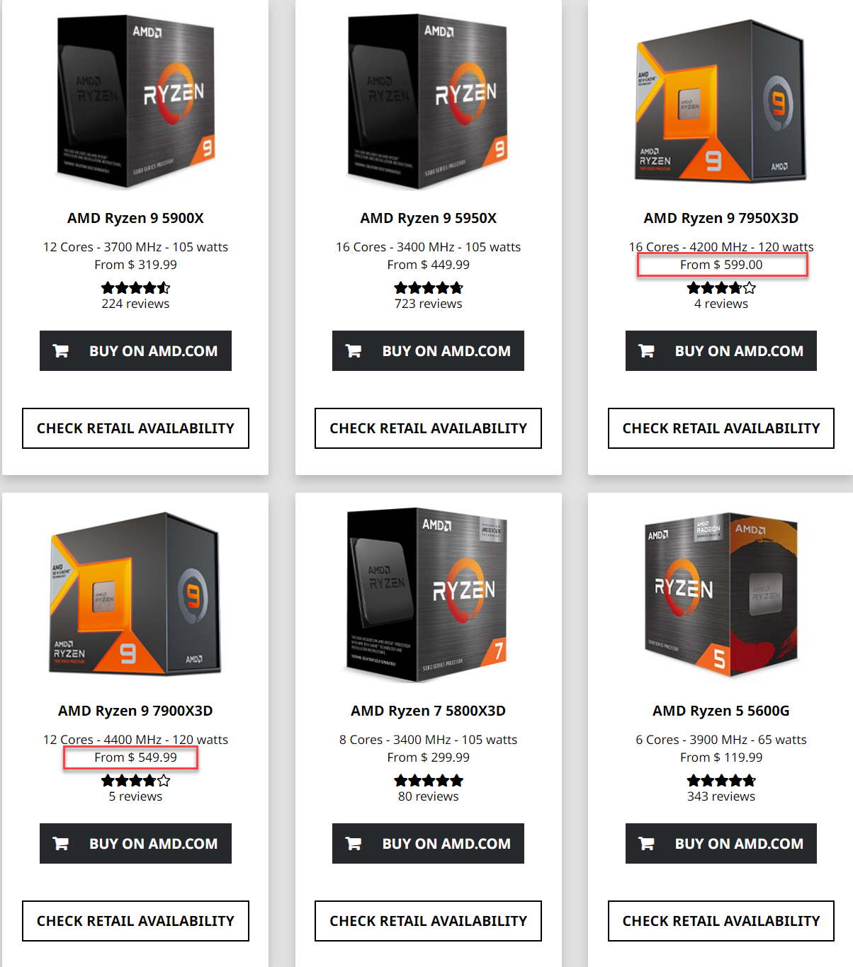 Ryzen 9 7950X3D и 7900X3D подешевели на 100 и 50 долларов соответственно, до 600 и 550 долларов. Правда, тут стоит отметить, что снижение цен на официальном сайте было зафиксировано два дня назад, а уже сейчас Ryzen 9 7950X3D стоит те же 700 долларов, которые и стоил на старте. А вот скидка на Ryzen 9 7900X3D остаётся в силе, и к тому же по этой цене CPU предлагают некоторые сторонние продавцы.