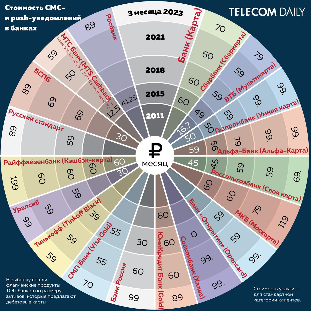 За последние пять лет стоимость SMS-информирования у крупнейших российских банков выросла в среднем на 53,7% — от 17% у Сбербанка до 230% у банка «Россия». Об этом свидетельствует исследование информационного аналитического агентства TelecomDaily.