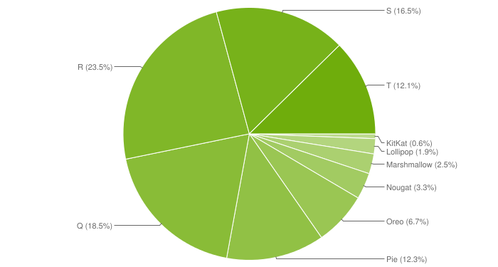 Как и следовало ожидать, доля рынка всех предыдущих версий Android сократилась. Удивительно, однако, что Android 11 (Red Velvet Cake) 2020 года по-прежнему сохраняет устойчивое лидерство, её доля составляет 23,5%, что значительно опережает Android 12 и 12L с совокупной долей 16,5%.