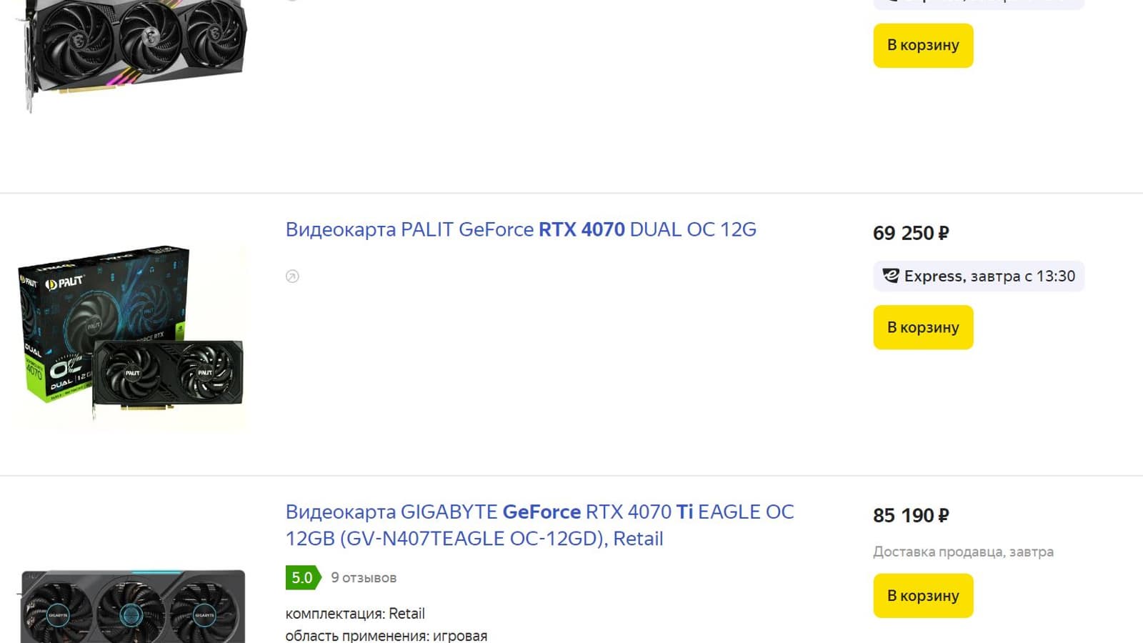 К примеру, 74 тыс. рублей просят за Palit GeForce RTX 4070 Gaming Pro 12G и 75 тыс. за RTX 4070 Ti Gaming Pro. Или вот другой пример: 79,75 тыс. рублей за MSI GeForce RTX 4070 Gaming X Trio – и всего 85,19 тыс. рублей за GeForce RTX 4070 Ti Eagle OC.