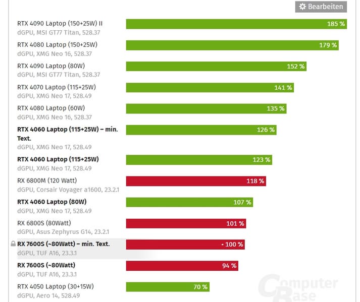 Также можно отметить, что RX 7600S показывает ту же производительность, что и 80-ваттная версия RX 6800S, а у последней больше вычислительных блоков. Если же сравнивать RX 7600S с RTX 4050 Laptop, первая оказывается в полтора раза быстрее.