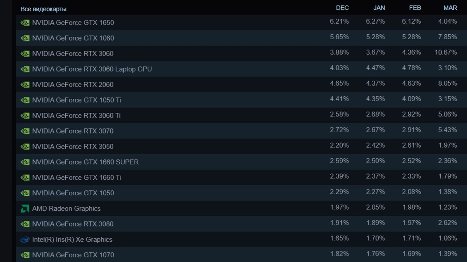 Похоже, в статистике Steam в прошлом месяце произошёл либо какой-то сбой либо имело место какое-то странное событие. По итогам марта статистика говорила о росте доли GeForce RTX 3060 с 4,36% до 10,67%, теперь же показатель снова упал примерно до изначального значения: до 4,66%.