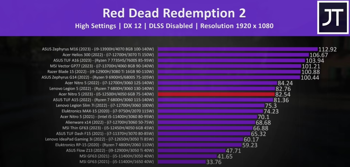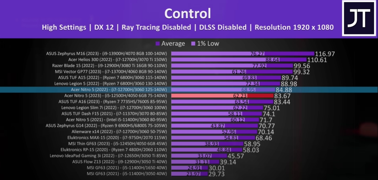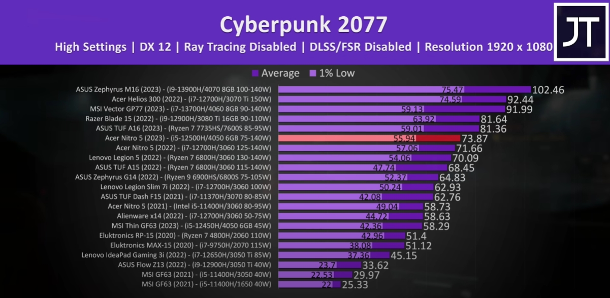 Давно не секрет, что мобильные видеокарты очень сильно зависят от лимитов мощности, и условная GeForce RTX 3060 Laptop может быть быстрее RTX 3070 Laptop. Свежий обзор ноутбука Acer Nitro 5 позволяет понять, на что способна самая быстрая версия RTX 4050 Laptop на фоне многих конкурентов.