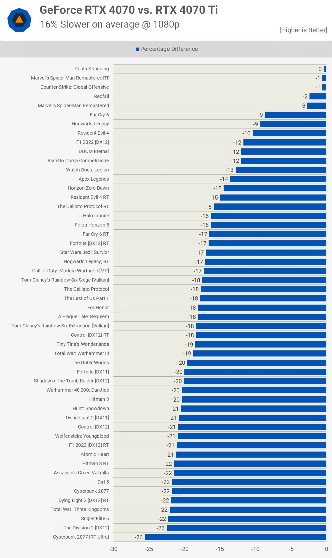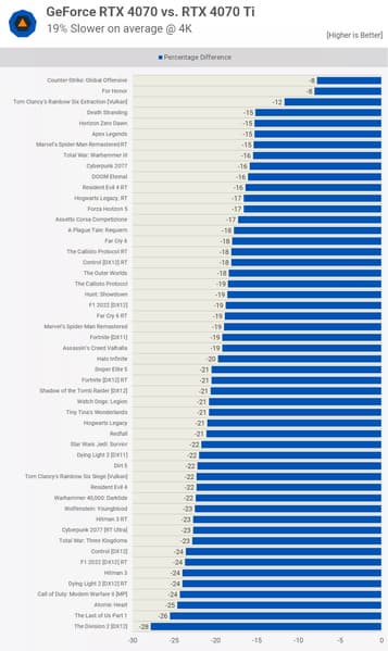 Можно найти и ещё несколько игр, где разница между RTX 4070 и RTX 4070 Ti, возможно, не столь огромна, но при этом она важна, так как младшая карта попросту не справляется. Однако в целом в большинстве игр оба адаптера отлично показывают себя в том числе и в 4K. Тем более, у них идентичная подсистема памяти с 12 ГБ и 192-разрядной шиной.
