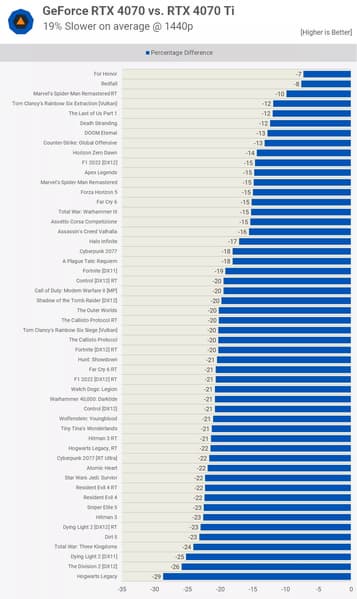 Как показало тестирование в огромном количестве игр (40 проектов), по соотношению цены и производительности младшая карта выглядит намного лучше, то есть переплата за RTX 4070 Ti с этой точки зрения того не стоит.