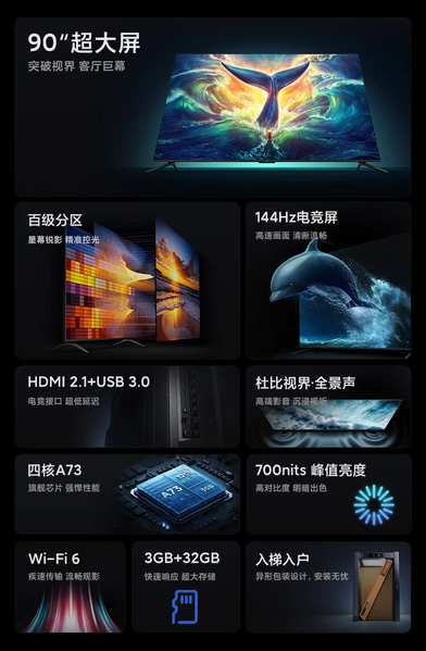 Redmi Max 90 получил однокристальную систему с четырьмя ядрами Arm Cortex-A73, 3 ГБ оперативной и 32 ГБ флеш-памяти, модуль Wi-Fi 6, порты HDMI 2.1 и USB 3.0, поддержку переменной частоты обновления VRR и низкой задержки, что пригодится поклонникам видеоигр.