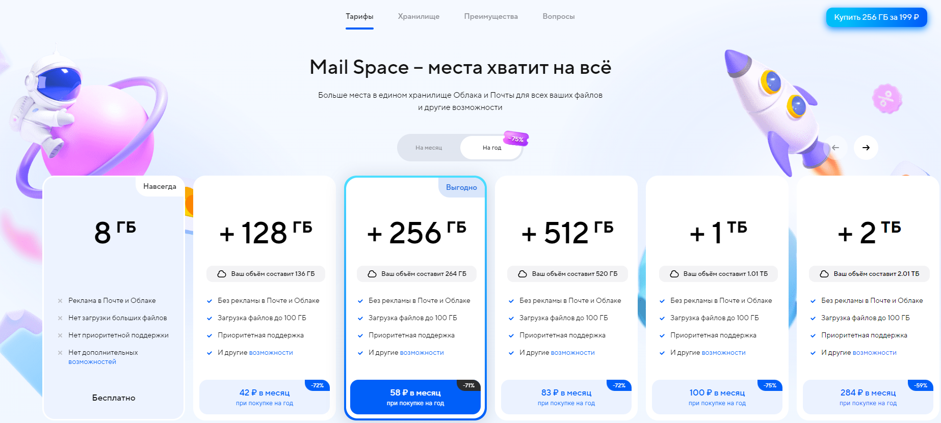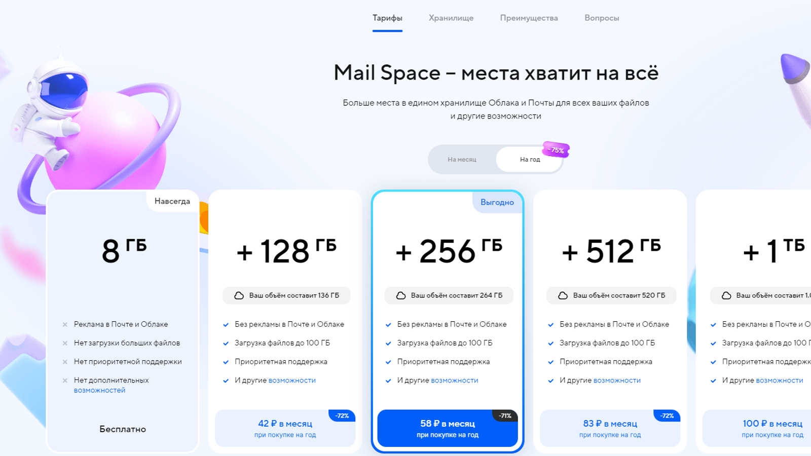 Пользователям предлагают разные тарифы с подходящим размером облачного хранилища, при этом цена на популярные тарифы снижены. Подписка на 256 ГБ на 12 месяцев подешевела на 46%, а тариф на 4 ТБ стал доступнее на 50% по сравнению с прошлым годом.