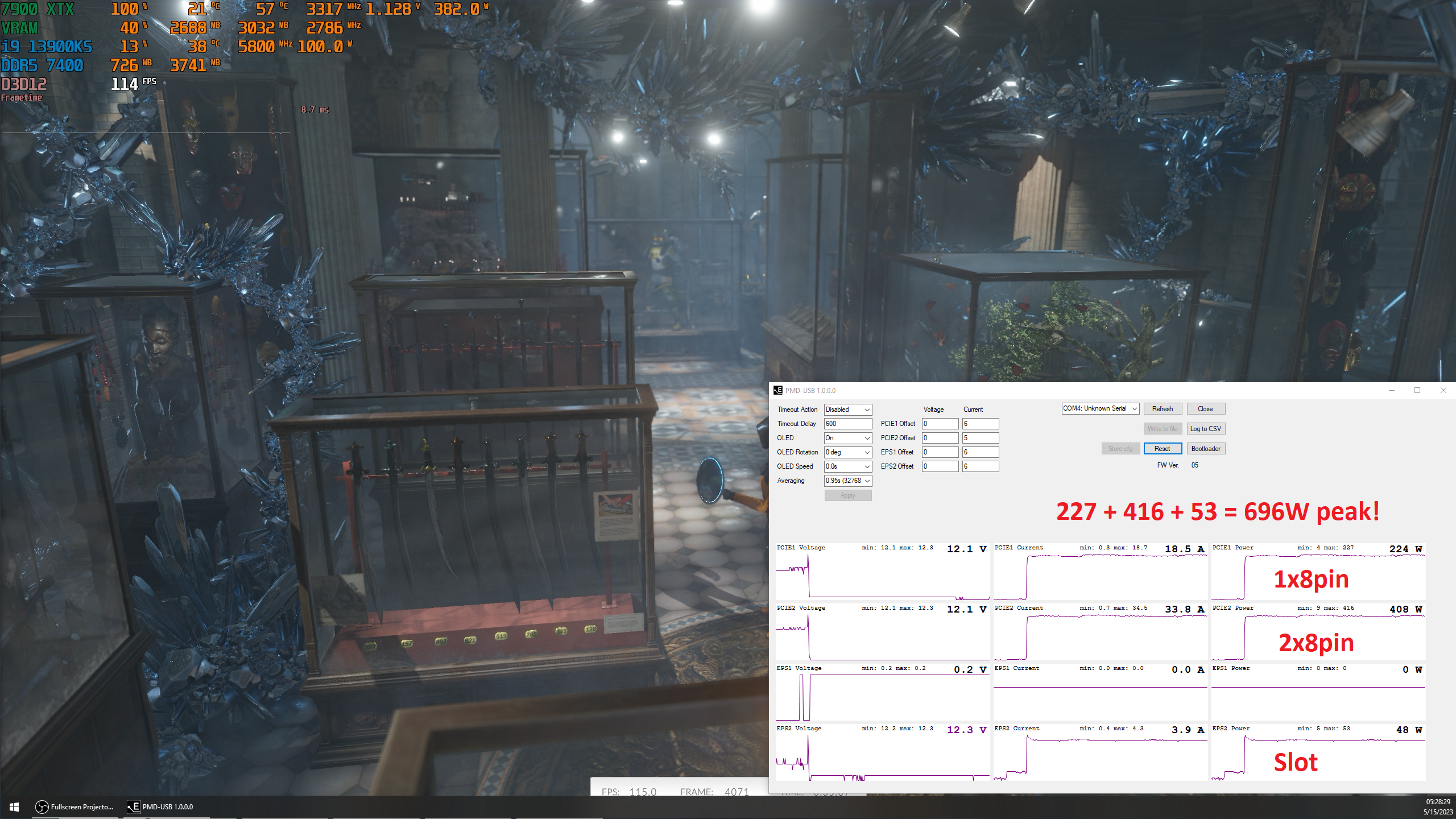 В итоге графическое ядро адаптера работало на частоте до 3467 МГц, и в таком режиме карта потребляла до 696 Вт! Это почти вдвое больше обычного потребления RX 7900 XTX.