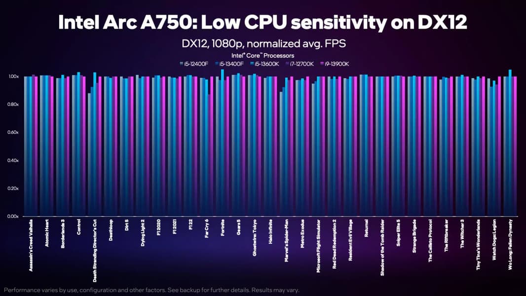 В случае Arc A750 и взятой для сравнения RTX 3060 разница между Core i5-12400F и Core i9-13900K составляет 6-7%. Стоит отметить, что тестировала Intel в разрешениях Full HD и 1440p, как самых распространённых. В 4K процессор будет ещё менее важен для игр.
