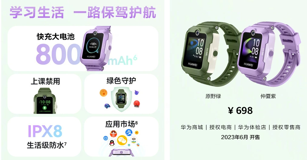 Детские часы Huawei Children's Watch 5 представлены в двух цветах: зеленом и фиолетовом. Их можно заказать в Китае по цене 99 долларов, а открытые продажи запланированы на июнь.