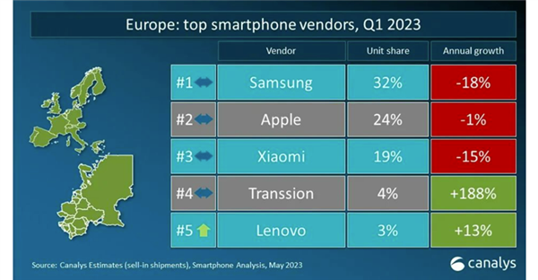 Впрочем, в случае Европы больше впечатляет результат компании Transsion, которой принадлежат бренды Tecno и Infinix. Оказывается, даже в Европе эта компания уже в четвёрке лидеров с ростом на 188%! Снова-таки, как и в случае Motorola, в абсолютном выражении у компании пока лишь 4% рынка, тогда как у Xiaomi на третьем месте уже 19%.