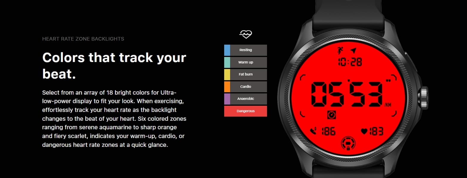 TicWatch Pro 5 также могут похвастаться двойным экраном. Основной представляет собой панель AMOLED диаметром 1,47 дюйма с разрешением 466 х 466 пикселей, а второй — это сегментный монохромный экран Ultra Low Power Display. Именно благодаря ему часы могут проработать до 45 дней от одного заряда, но не только. 80 часов автономности в основном режиме — это также отчасти заслуга второго дисплея. Дело в том, что он тут выполняет роль заменителя функции Always OnDisplay. Именно этот экран активируется, когда пользователь поднимает руку, чтобы посмотреть время. Основной дисплей включается только при ручной активации часов.