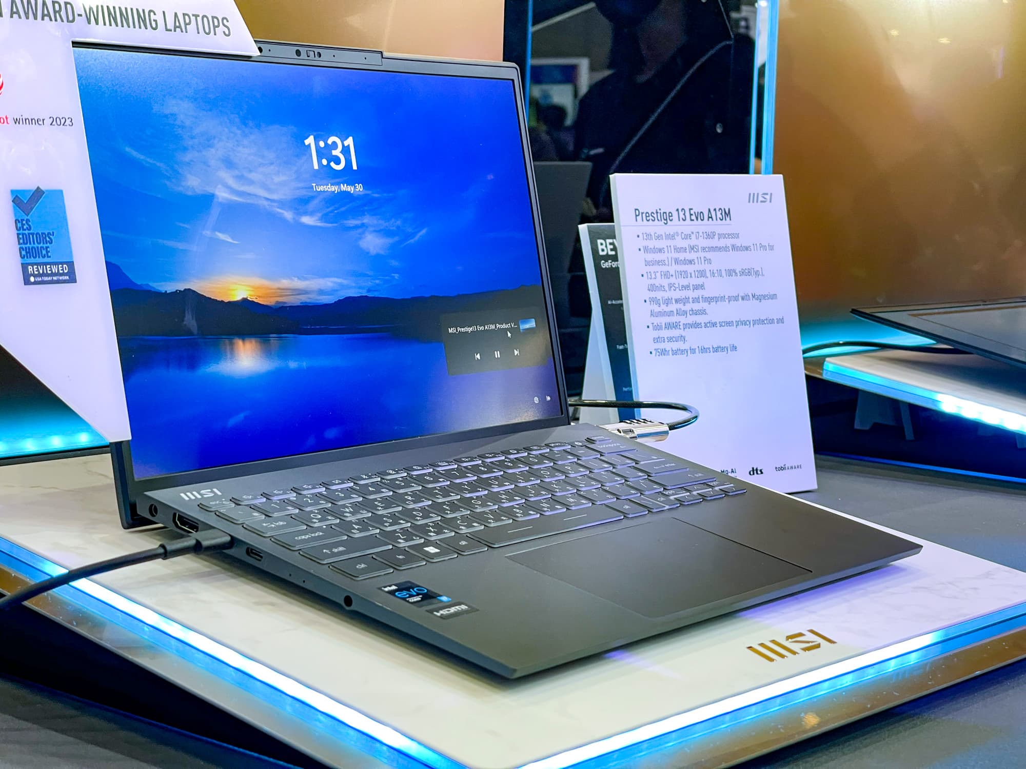 Prestige 13 Evo — модель, примечательный массой: это первый 13-дюймовый ноутбук в линейке MSI весом всего в 990 г. В нем использован процессор Intel Core i7-1360P с интегрированной графикой. От батареи ёмкостью 75 Вт·ч ноутбук работает до 16 часов.