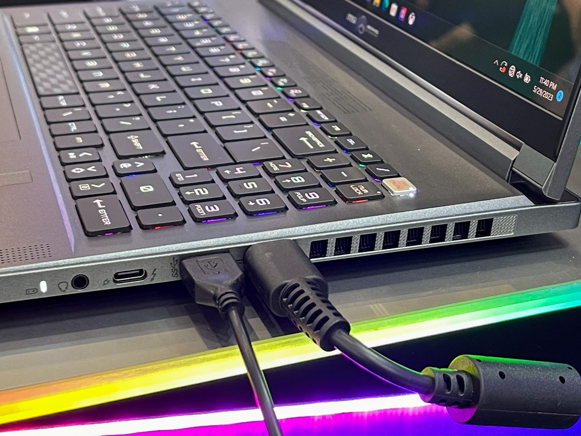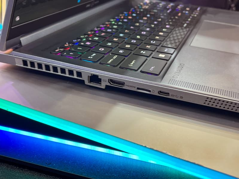 Экран — 16-дюймовый, на базе матрицы OLED разрешением 3840x2400 с частотой 60 Гц (часто продвинутые модели снабжаются дисплеями с более высокой кадровой частотой: например, 90, 144, 165 Гц и т. д.). Объём оперативной памяти и SSD не называется. Клавиатура — SteelSeries с RGB-подсветкой в каждой клавише. Набор портов включает: