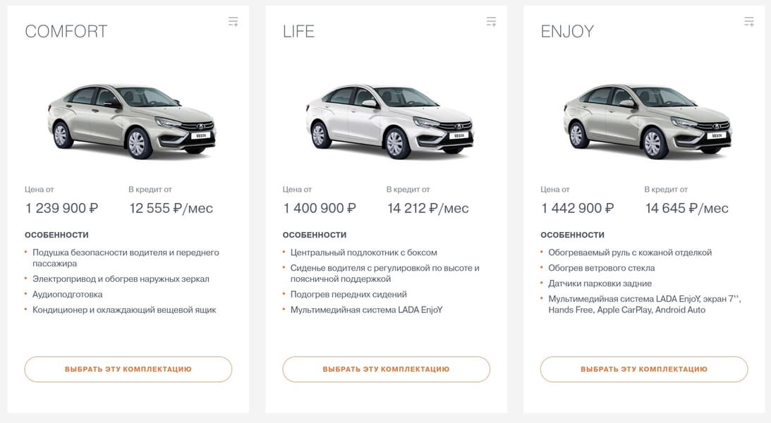 Теперь не обязательно вчитываться в мелкий шрифт прайс-листа или присматриваться к чёрным точками, которыми отмечены опции — в конфигураторе все особенности (в том числе двигатель и цвет) представлены в простом и наглядном виде. Если говорить о седане, то он представлен четырьмя версиями: Comfort, Life, Enjoy и Techno. К слову, разнообразием цветов АвтоВАЗ пока совсем не балует: базовый — белый, за доплату в 15 тыс. рублей доступен цвет «Серебристый платина (691) — металлик». В этом цвете топовый седан в исполнении Techno обойдётся в 1,58 млн рублей.