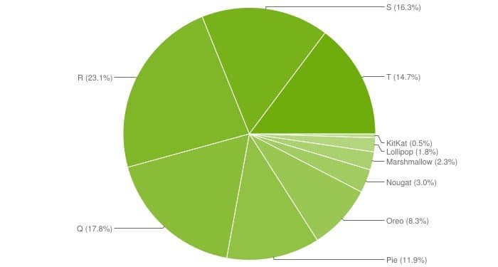 Наиболее распространённой версией является Android 11. Данная система установлена на 23,1% всех активных устройств. Далее следует ещё более старая Android 10 с 17,8%, но в спину ей дышит Android 12 с 16,3%.