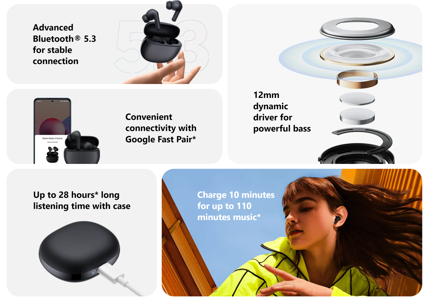 Наушники Redmi Buds 4 Active оснащены 12-мм динамиками (в стандартной версии 10 мм), поддерживают активное шумоподавление и характеризуются влагозащитой IPX4.