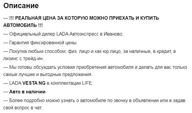 Вот типичный пример. Дилер предлагает приобрести Lada Vesta NG в комплектации Life, но только не за 1,4 млн рублей, как в конфигураторе на официальном сайте, а за 1,59 млн рублей. В объявлении крупными буквами сказано, что это «реальная цена, за которую можно приехать и купить автомобиль».