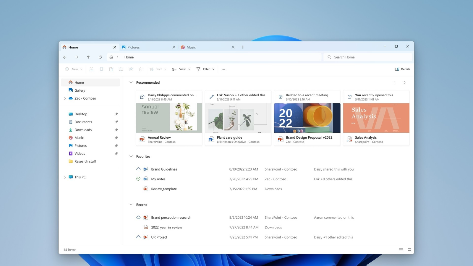 «Проводник» получил переработанный дизайн, включая главную страницу с каруселью рекомендованных файлов, панель инструментов, меню, панель поиска и дерево навигации. Карусель рекомендуемых файлов будет отображаться, если пользователь вошёл в Windows 11 под учётной записью Azure Active Directory (AAD).