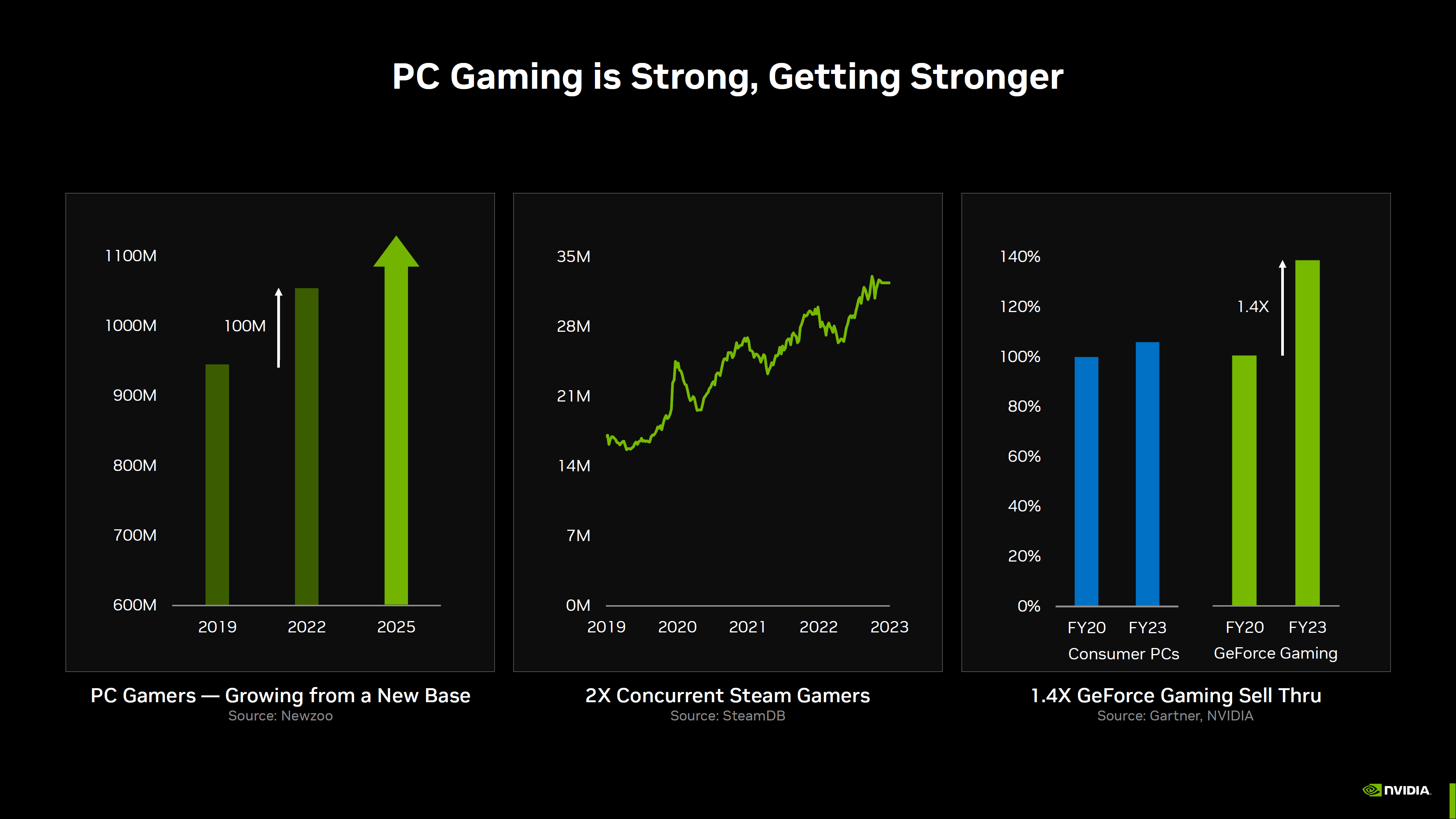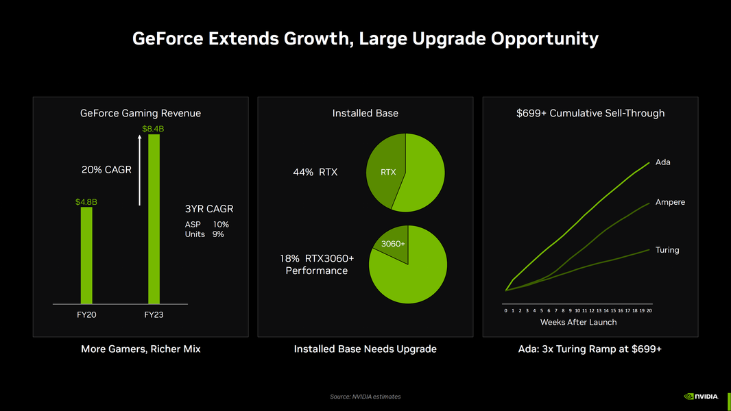 Если говорить обо всём рынке в целом, то адаптеры семейства RTX имеются у 44% владельцев карт Nvidia. 18% всех пользователей Nvidia имеют карты мощнее RTX 3060. Это говорит о том, что имеется огромная база геймеров, которые потенциально могут покупать новые карты RTX 40, в том числе дорогие.