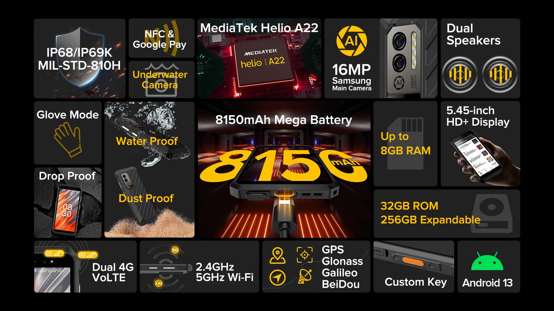 Экран основан на панели IPS с разрешением 1440 х 720 пикселей. Само собой, смартфон хорошо защищён: тут и защита от воды и пыли (IP69K), и стандарт MIL-STD-810H.