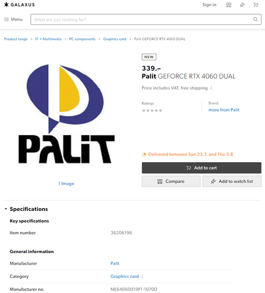 Модель Palit RTX 4060 Dual оценена в 340 евро. Поставку обещают с период с 23 июня по 3 августа, но официально продажи начнутся только 29 июня.