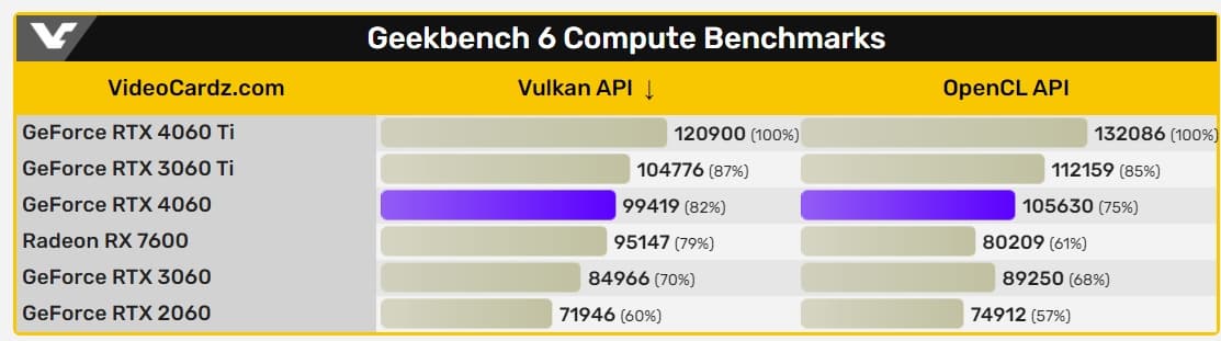 Если возвращаться к Geekbench, новинка Nvidia также на 4% и 32% быстрее Radeon RX 7600 в зависимости от подтеста. Но в OpenCL новинка AMD заодно ощутимо медленнее, чем RTX 3060, а в играх, как мы знаем, RX 7600 быстрее примерно на 15–20%.