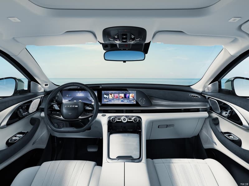 А вот интерьер совершенно новый, как у Exeed RX, закрытый показ которого уже состоялся в России. В салоне (в топовой версии он двухцветный) два экрана с диагональю 12,3 дюйма, атмосферная подсветка с 256 цветами, сиденья с кожей Nappa и встроенным массажёром (передние), акустическая система формата 7.1.4 с 23 динамиками. И это далеко не полный список.