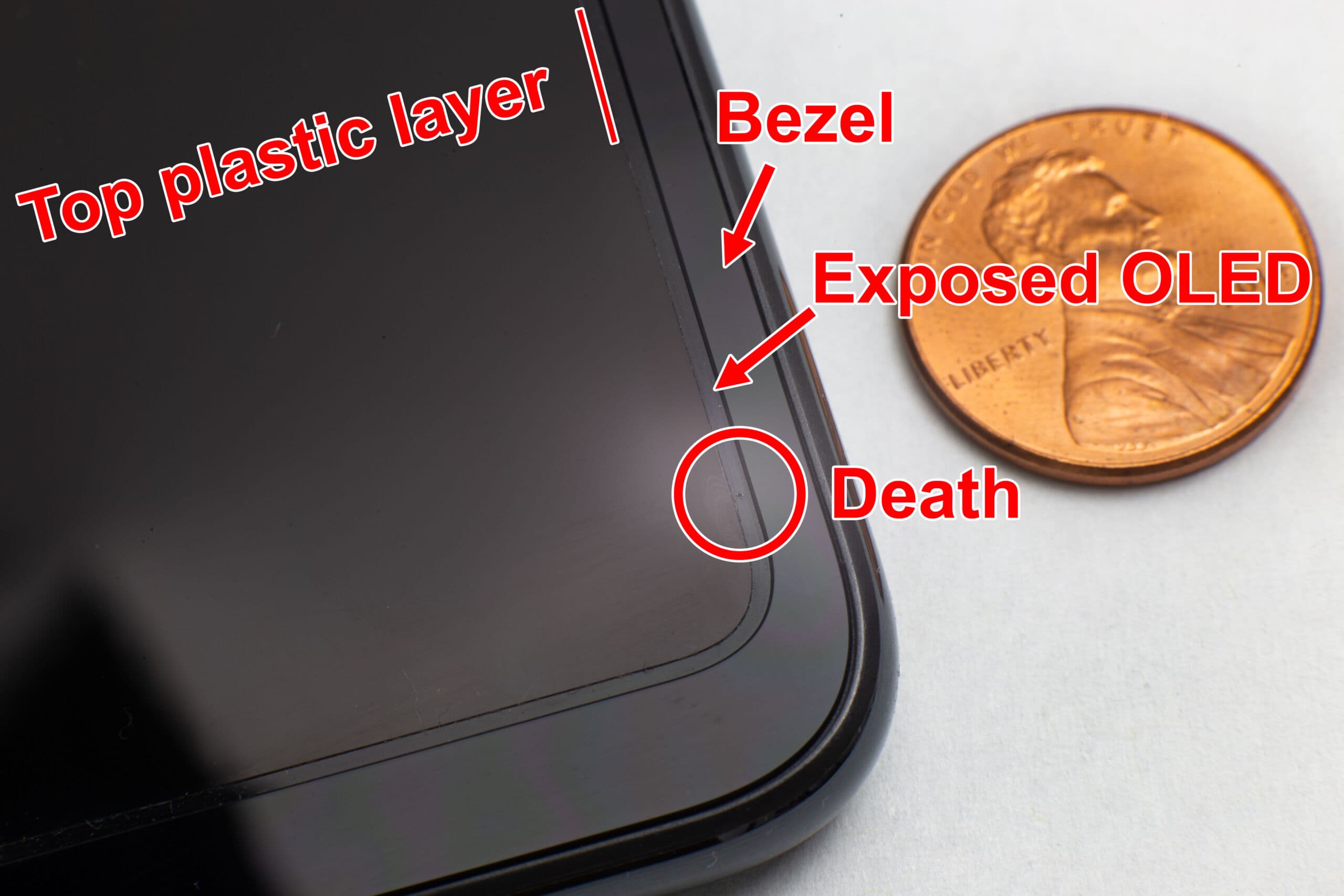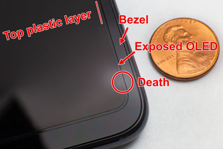 Этот пластиковый слой имеет решающее значение для выживания OLED, но он не покрывает экран до краёв. Каждая компания, производящая эти экраны, оставляет зазор по периметру дисплея, где нет пластикового слоя, а открытая OLED-панель выглядывает наружу. Обычно мы ожидаем, что складной телефон сломается по складке, где экран испытывает наибольшую нагрузку. Но мой умер из-за этого открытого участка экрана.
