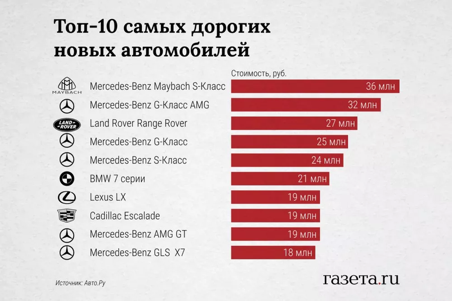 Mercedes-Benz Maybach S-Класс, Mercedes-Benz G-Класс AMG и Land Rover Range Rover возглавляют рейтинг. Также в список попали Mercedes-Benz G-Класс, Mercedes-Benz S-Класс, BMW 7-й серии и другие модели.